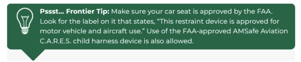 Frontier Airlines allows the use of AMSafe Child Aviation Restraint System (CARES) as an alternative to car seats.